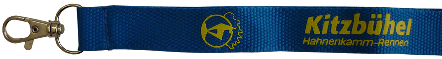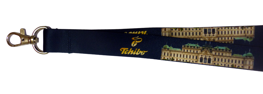 These textile ribbons with woven text or logos are particularly robust and durable. The motifs are firmly woven in and bonded to the textile lanyard, so no color can be rubbed off. They are suitable for lanyards that are used particularly frequently, e.g. when carrying an employee ID card or badge and are therefore subject to greater wear and tear. Only simple line graphics and text can be realized here. Color gradients and complicated logos cannot be used.